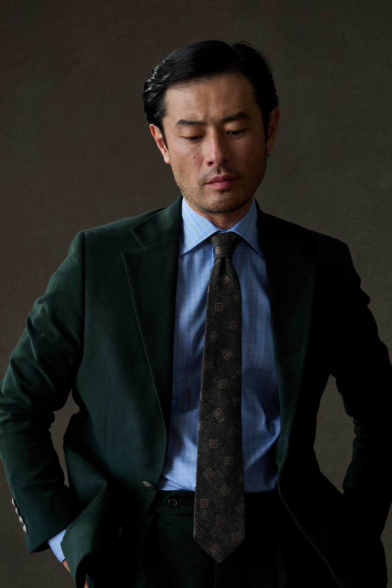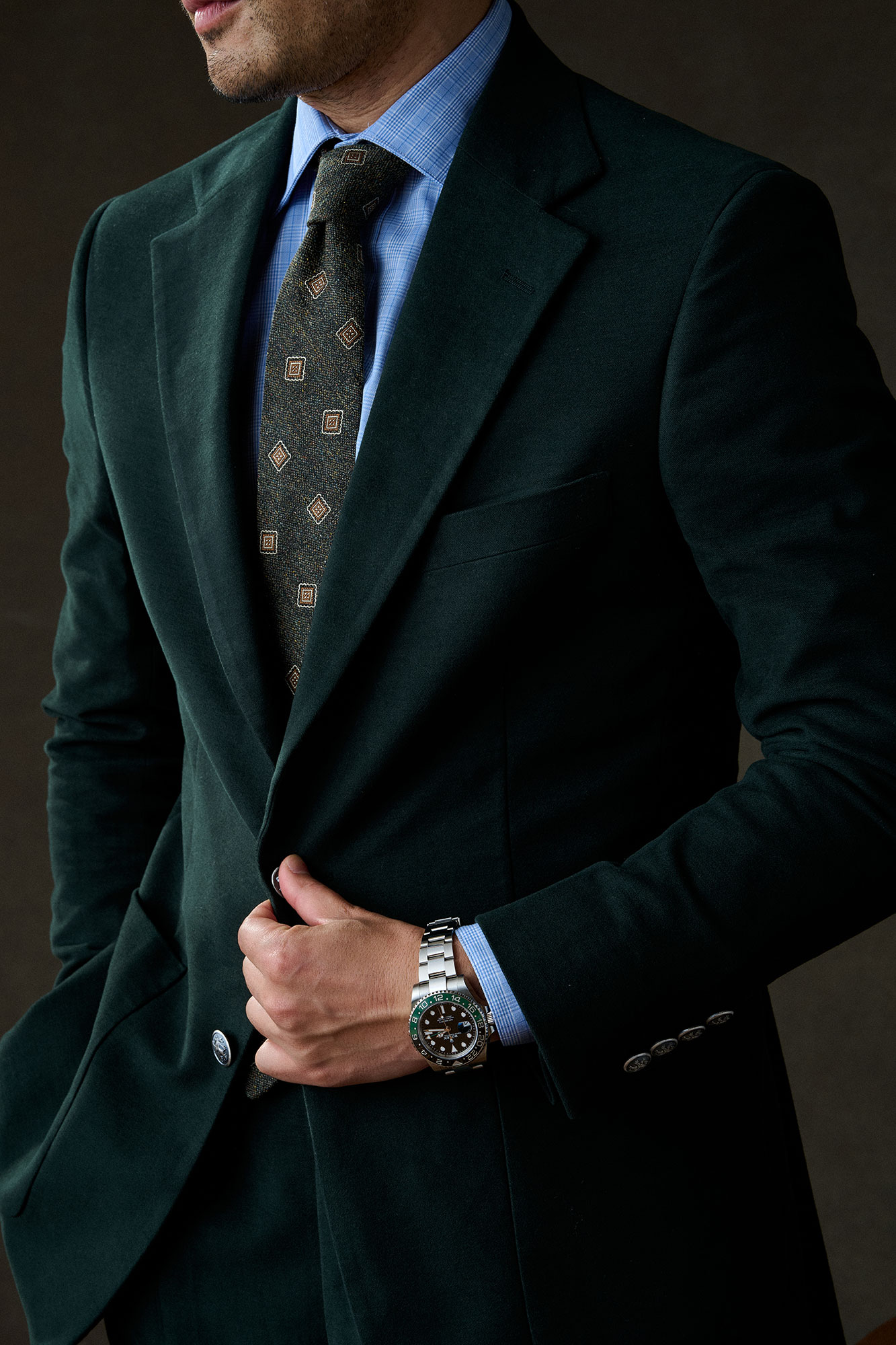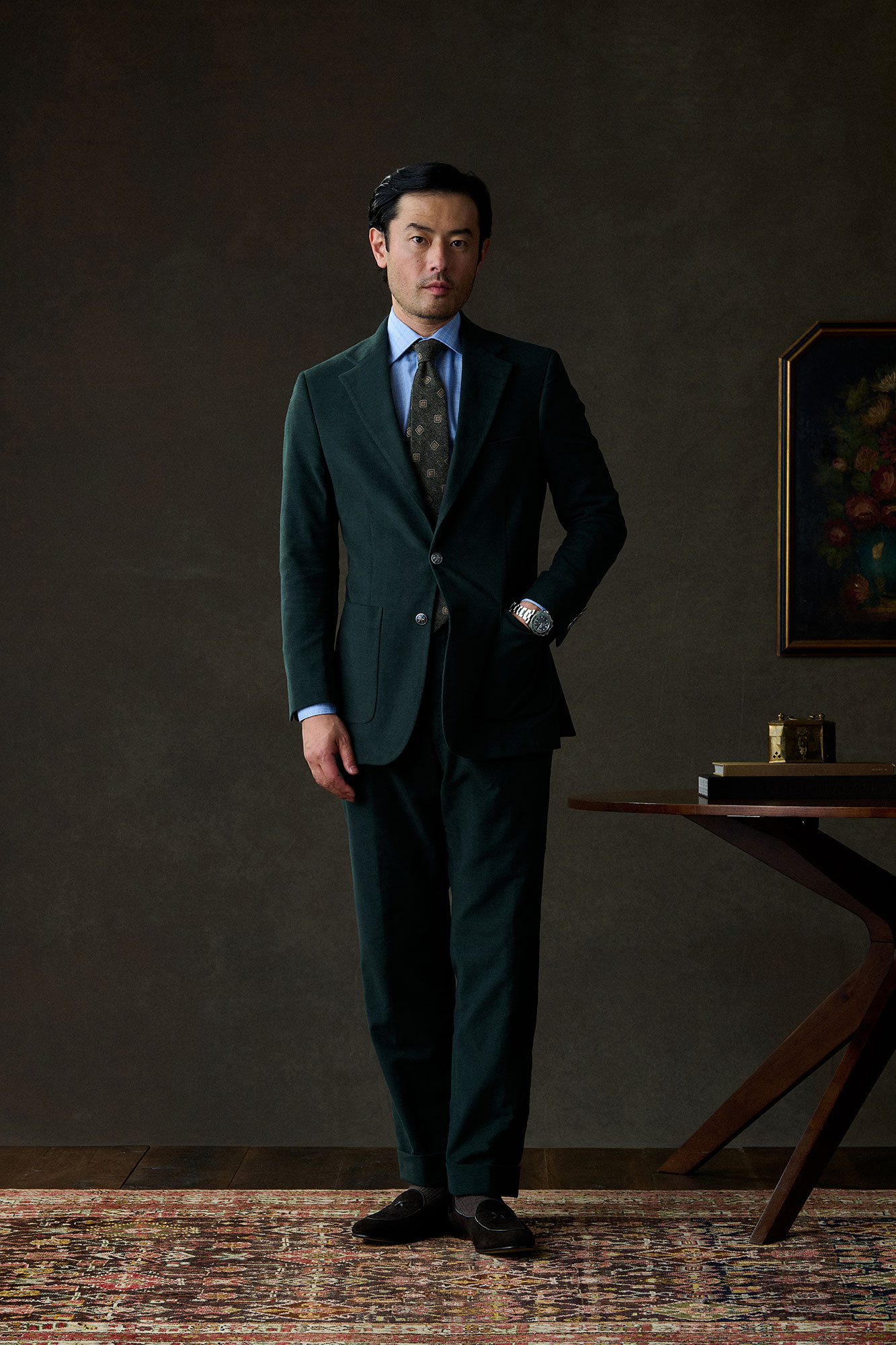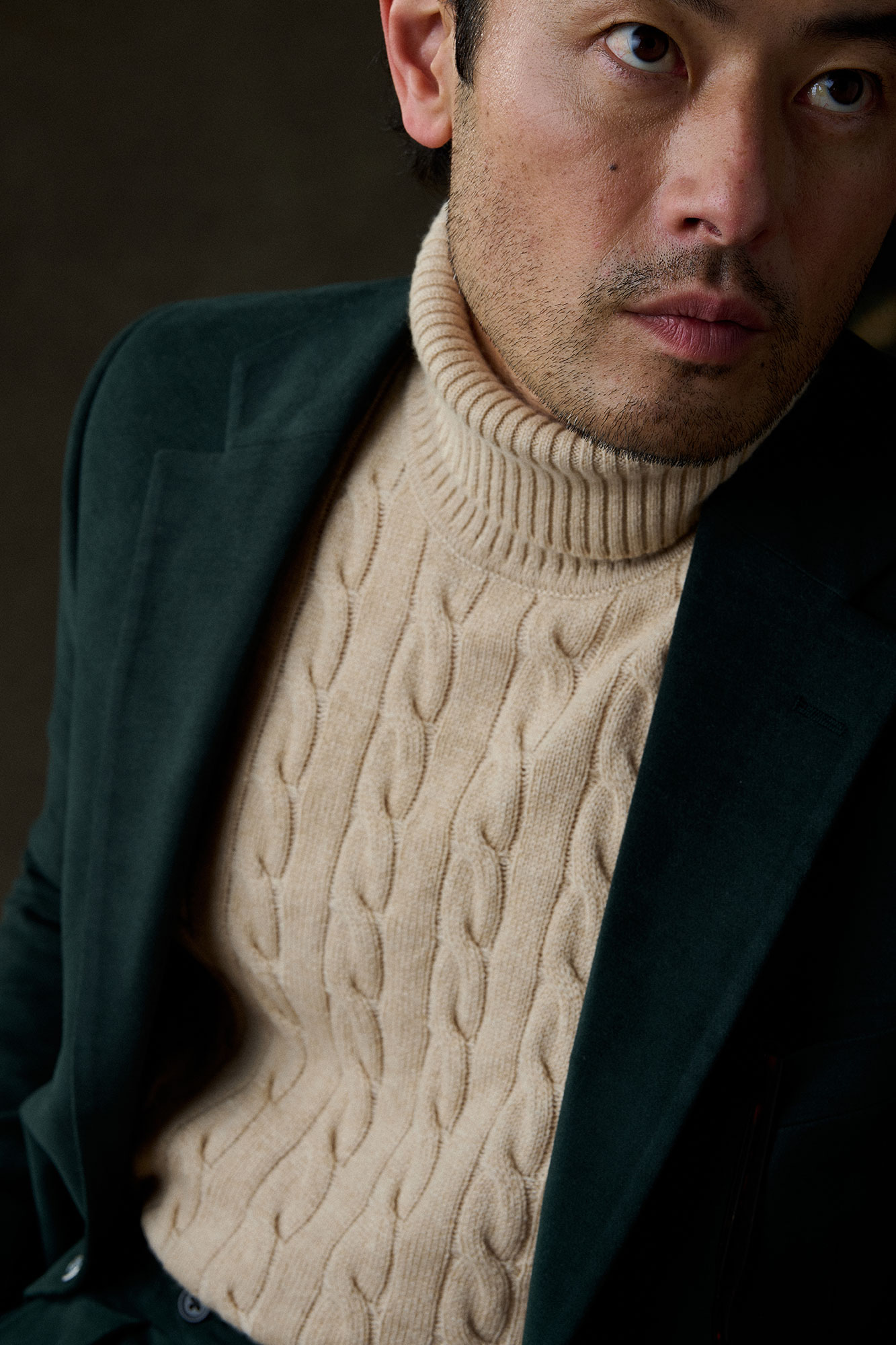 Green Moleskin Suit With Camel Cable Knit Turtleneck